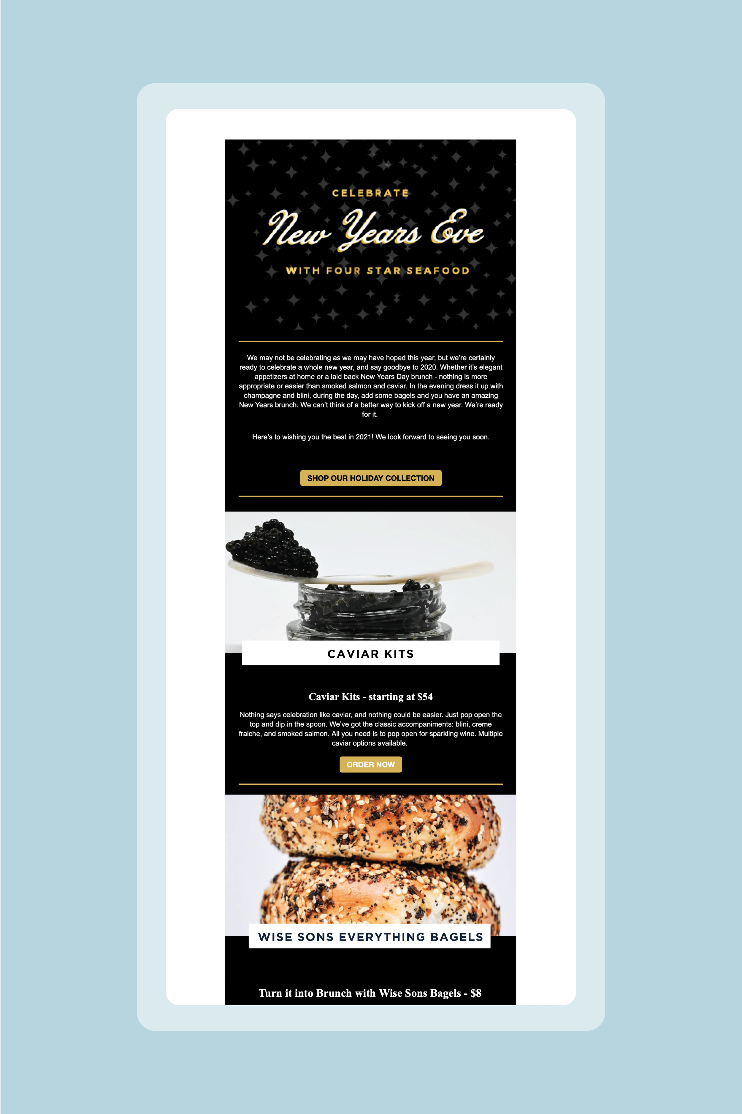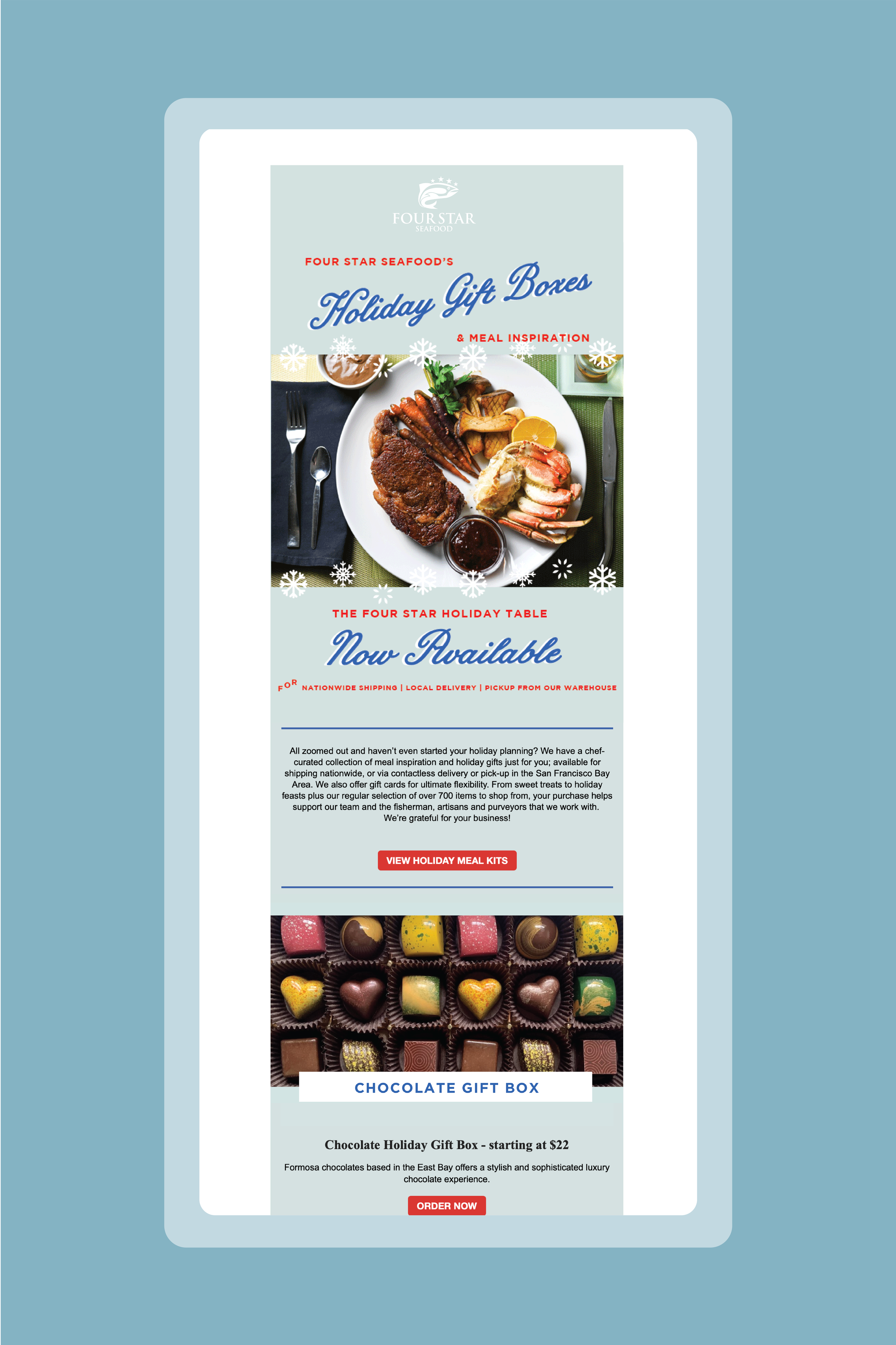 With the holidays approaching, Four Star realized they had another opportunity. Using their existing inventory, our team helped curate a selection of holiday gift offerings, including a very popular San Francisco-style cioppino. Customers loved having everything they needed to make this classic dish. Four Star had eliminated the most difficult part, finding and selecting the ingredients. Carbonate developed a strategic ad campaign to promote the holiday specials and attract new customers. The campaign attracted hundreds of new customers and brought in significant incremental income.