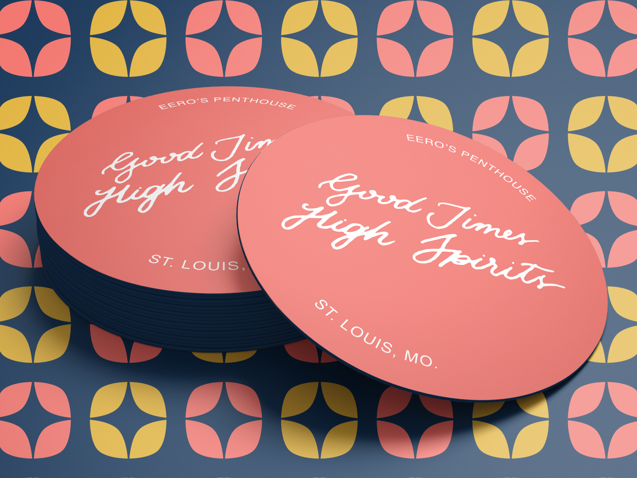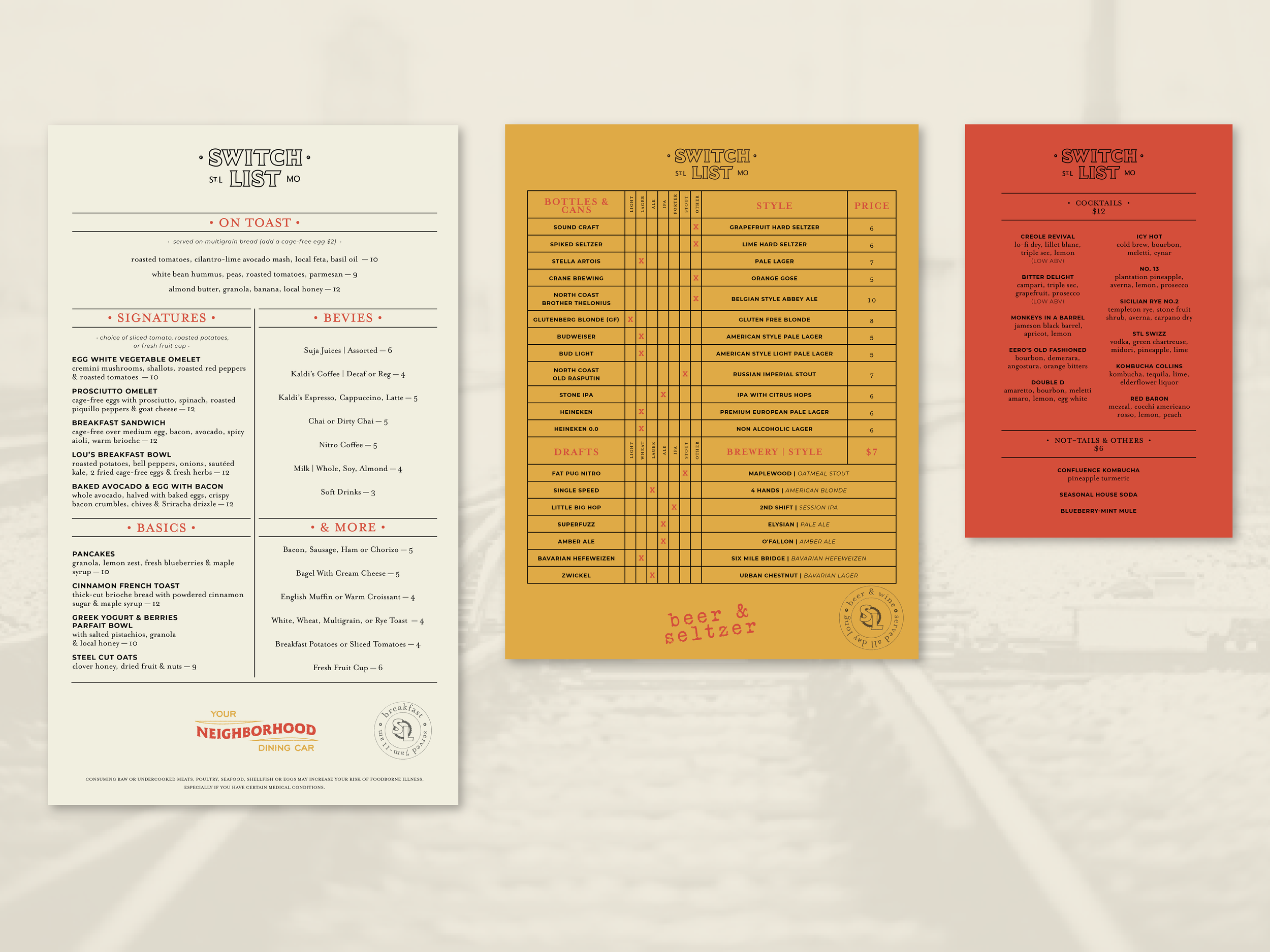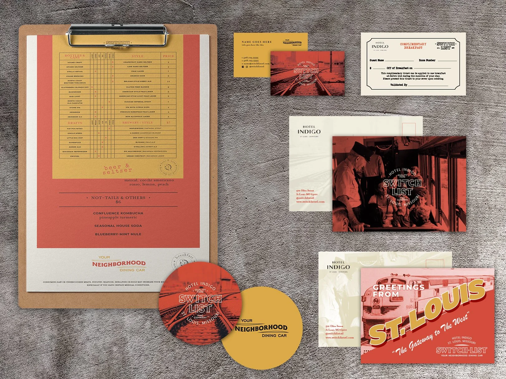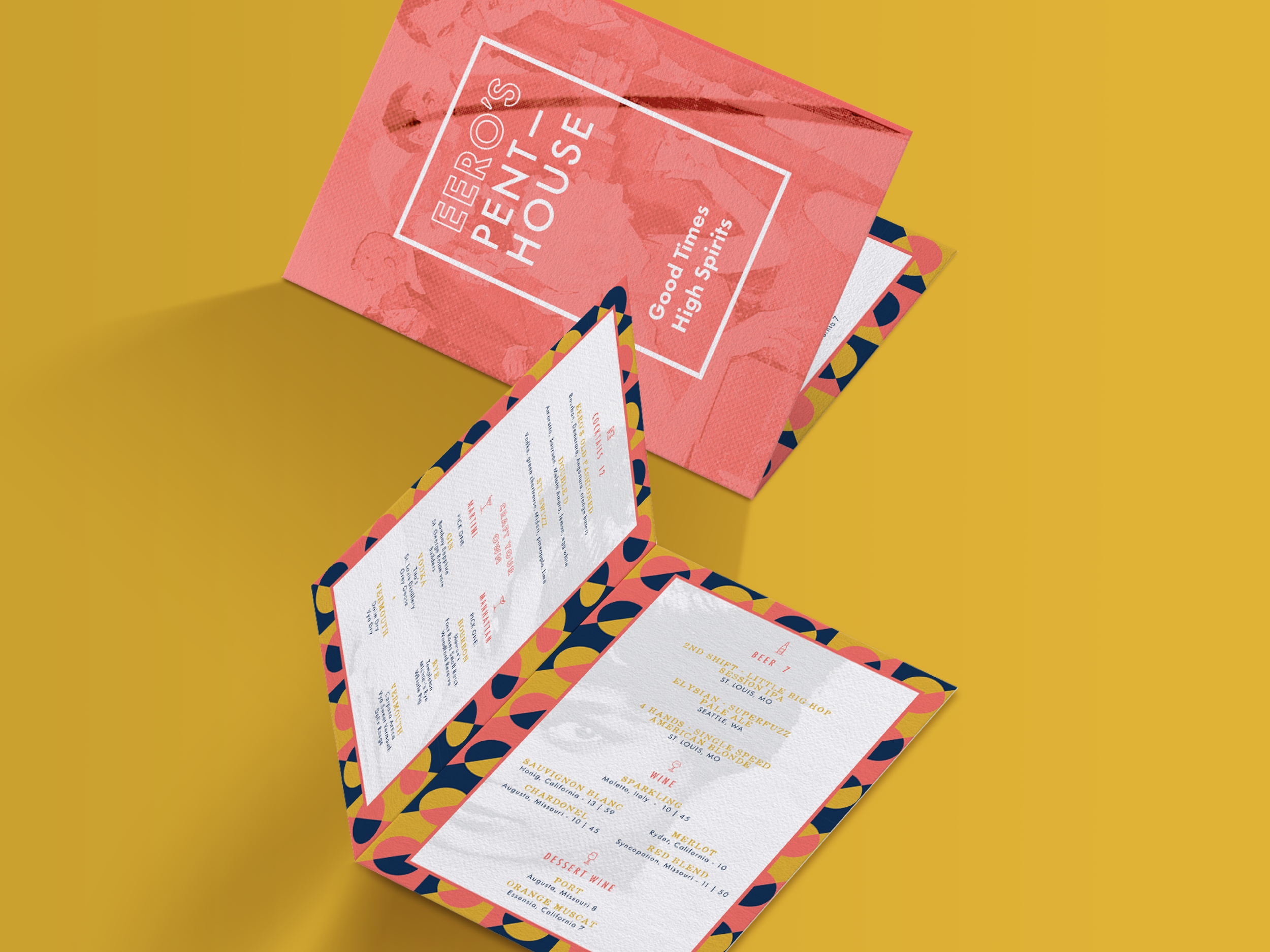 Picking up where the initial identity work left off, Carbonate fleshed out both brands with verbal identity development and visual identity refinements, bringing the brand to life through fun, vibrant, and conceptual-based collateral design. Capturing the unique spirit of St. Louis, Switch List utilizes turn-of-the-century train materials as inspiration. A clipboard with colored paper nods to a train conductor’s switching schedule and provides the operations team with an easy to update menu vessel. The rooftop bar, Eero’s Penthouse, invites guests to step back to the 1960’s when the living room cocktail party reigned supreme. Vintage imagery and pops of color communicate the identity and provide a sense of place. A menu shell that can be over-printed in-house creates an easy solution for the operators, while patterned coasters add color and personality to the space.