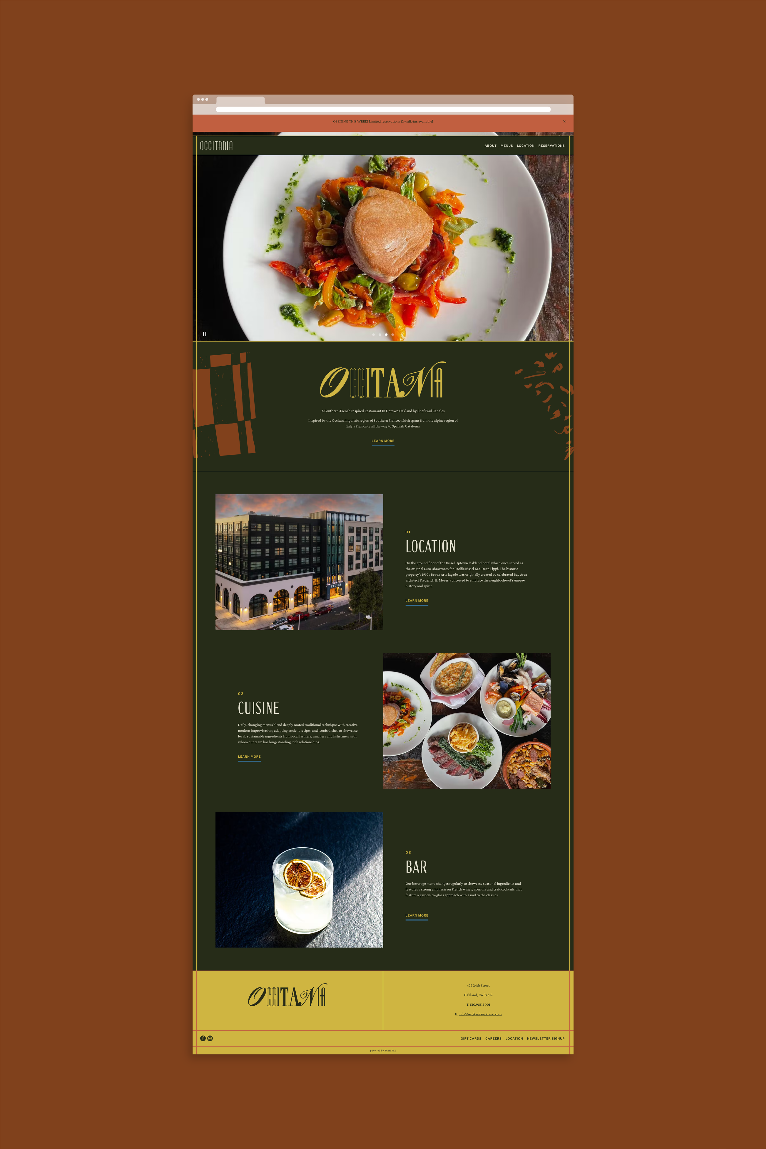 Inspired by regional southern French cuisine, Occitania (named after the traditional Occitan linguistic region) was conceived by Chef Paul Canales, who first made his mark on the Bay Area at Oliveto before becoming known for Spanish restaurant, Duende. Located in the design-forward boutique hotel, Kissel, in Oakland, CA, the restaurant honors the interplay between traditional and contemporary, and features a daily changing menu. The Occitania team reached out to us to help bring their vision to life, supporting both the development of the brand and its launch. Our team set out to craft a visual identity that would embrace and convey Chef Canales' highly-unique vision and approach based around ideas of polar opposites such as light vs. shadow, rusticity vs. refinement and spontaneity vs. methodology. In addition to the visual identity development, our team provided collateral design & development, website design, digital design and art direction for photoshoots. We also provided a comprehensive public relations launch strategy.