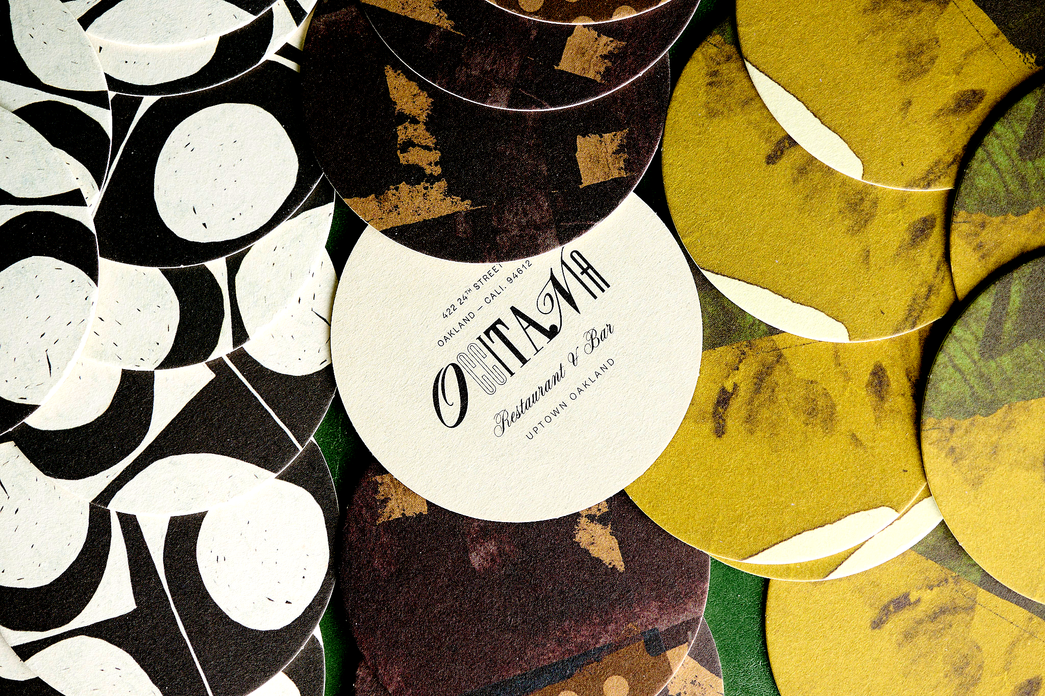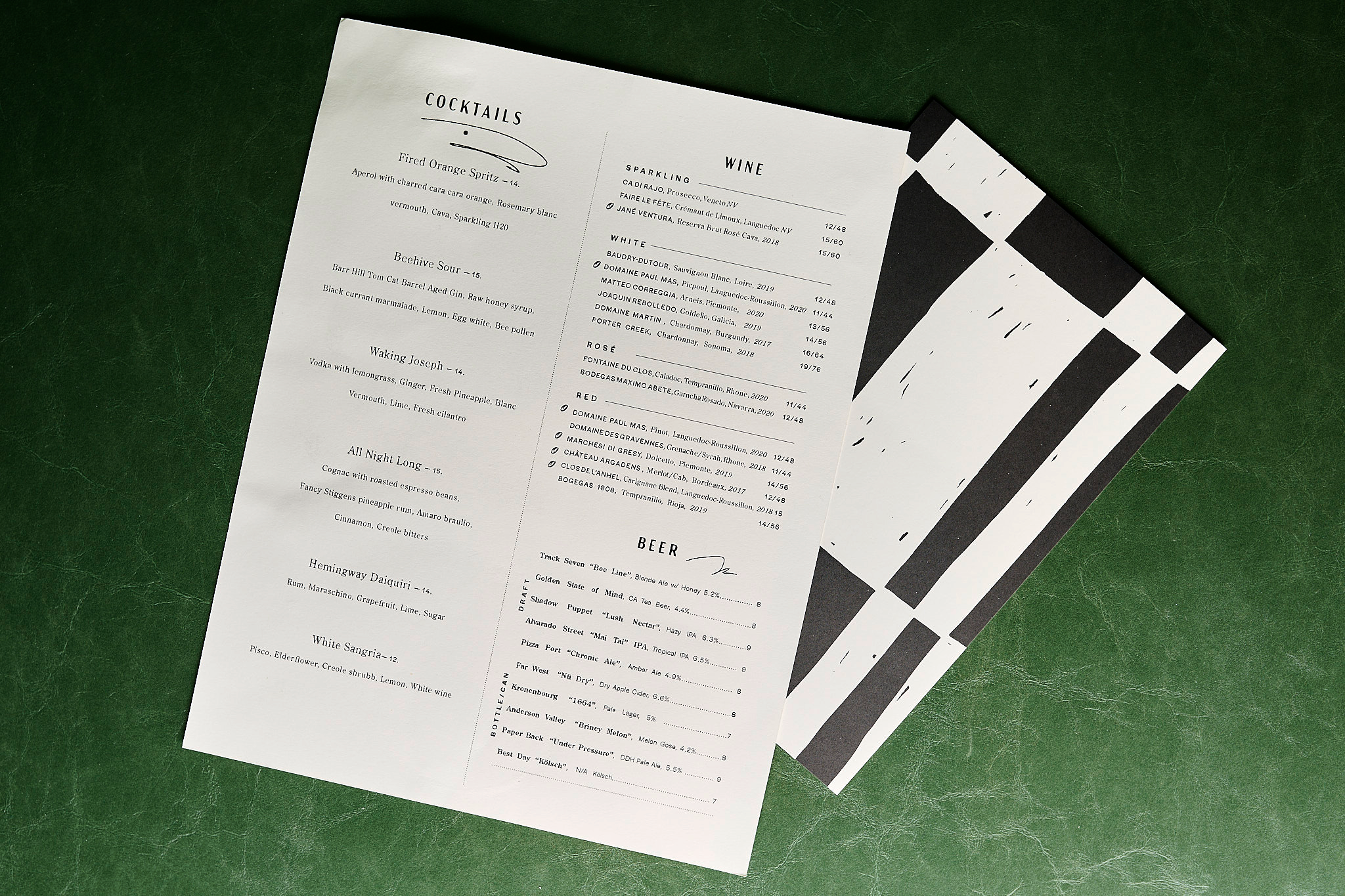 The restaurant space featured various artwork and installations from Bay Area-based artisans. Working from initial logo artwork by artist Sam Strand, our team developed a visual identity and supporting logo system inspired by the balance of duality. With correlations to Art Deco, Mid-Century Modern and Classical art, the extensive color palette is both bold and vibrant yet rich and earthy. Unexpected color combinations such as electric blue, apricot, mustard yellow, beige and emerald green connect subtly to materials used throughout the interior. A variety of custom patterns ranged from abstract brushstrokes, collaged paper and hand drawn motifs were used across menus, coasters, bespoke metallic foil check presenters in addition to digital applications like the website and social media graphics. The menu design draws inspiration from literature and sheet music with item descriptions that cascade down the page like the cadence of written poetry. The resulting identity and various touch points work in harmony to communicate than extraordinarily unique concept, conceived to awaken and enchant the senses.
